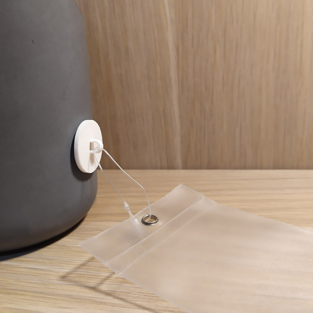 Pętelka spinająca 225 mm – przezroczysta żyłka do metek i etykiet – cenówka wisząca na haczyku samoprzylepnym, przyklejonym na wazonie